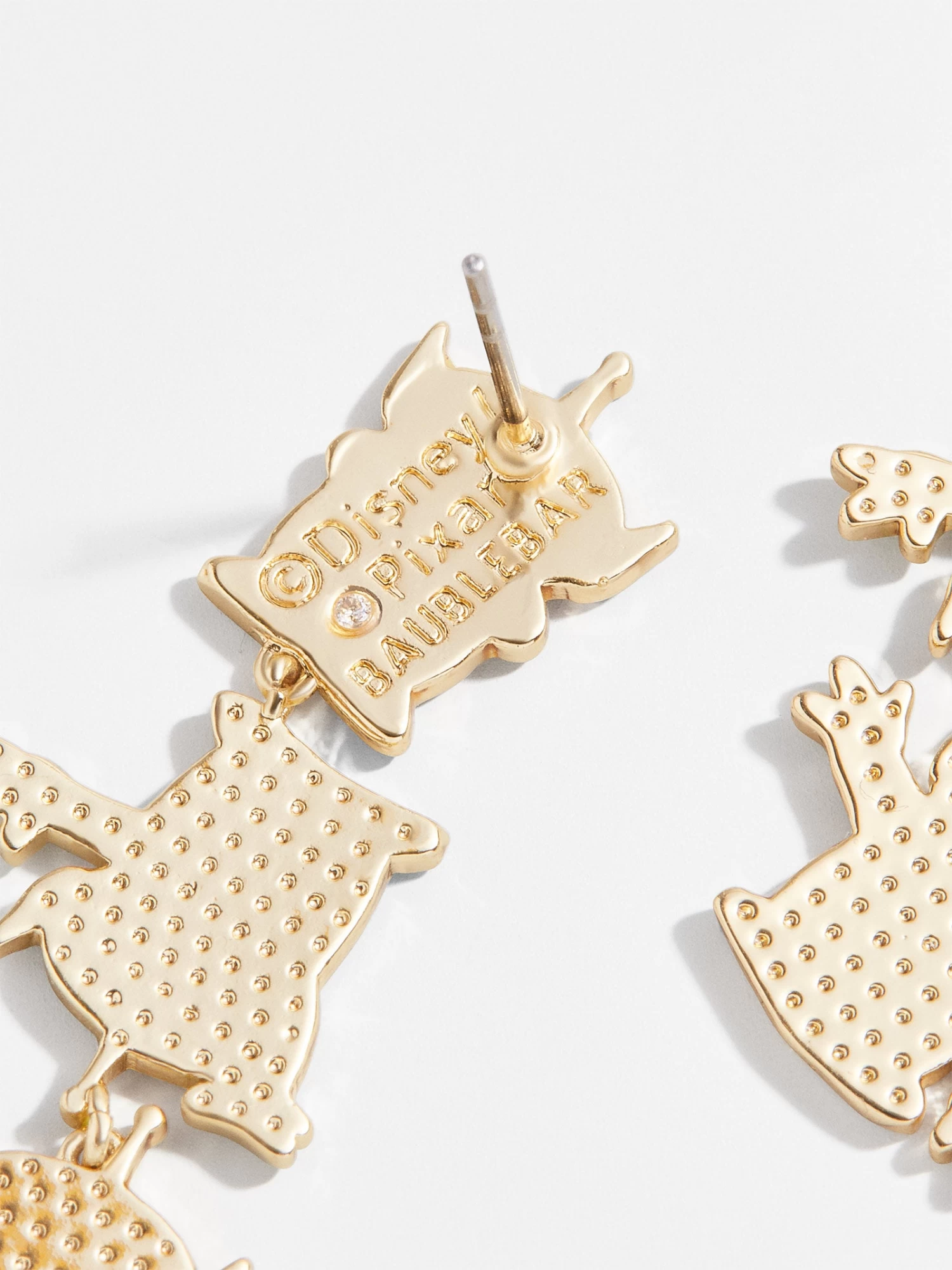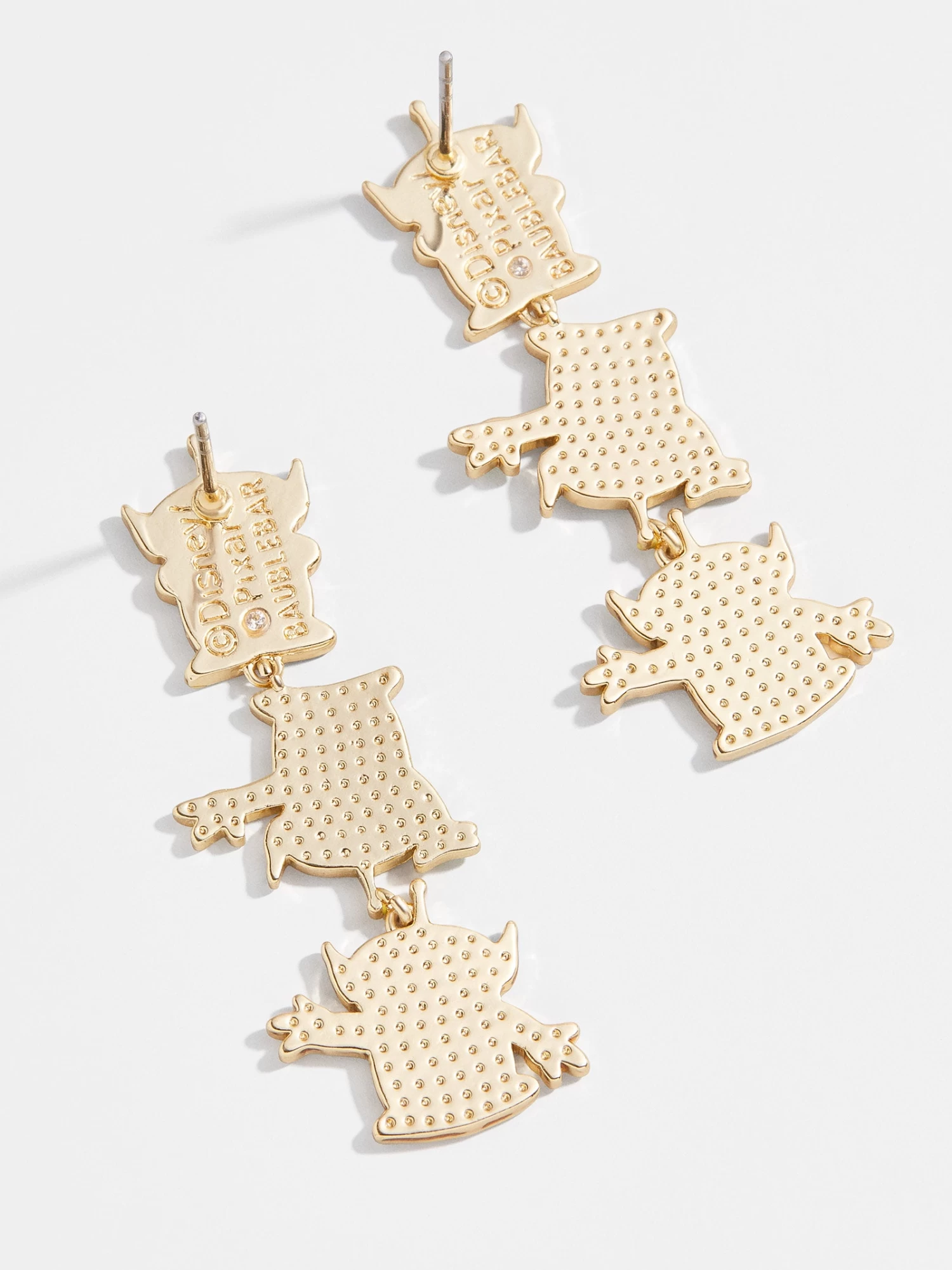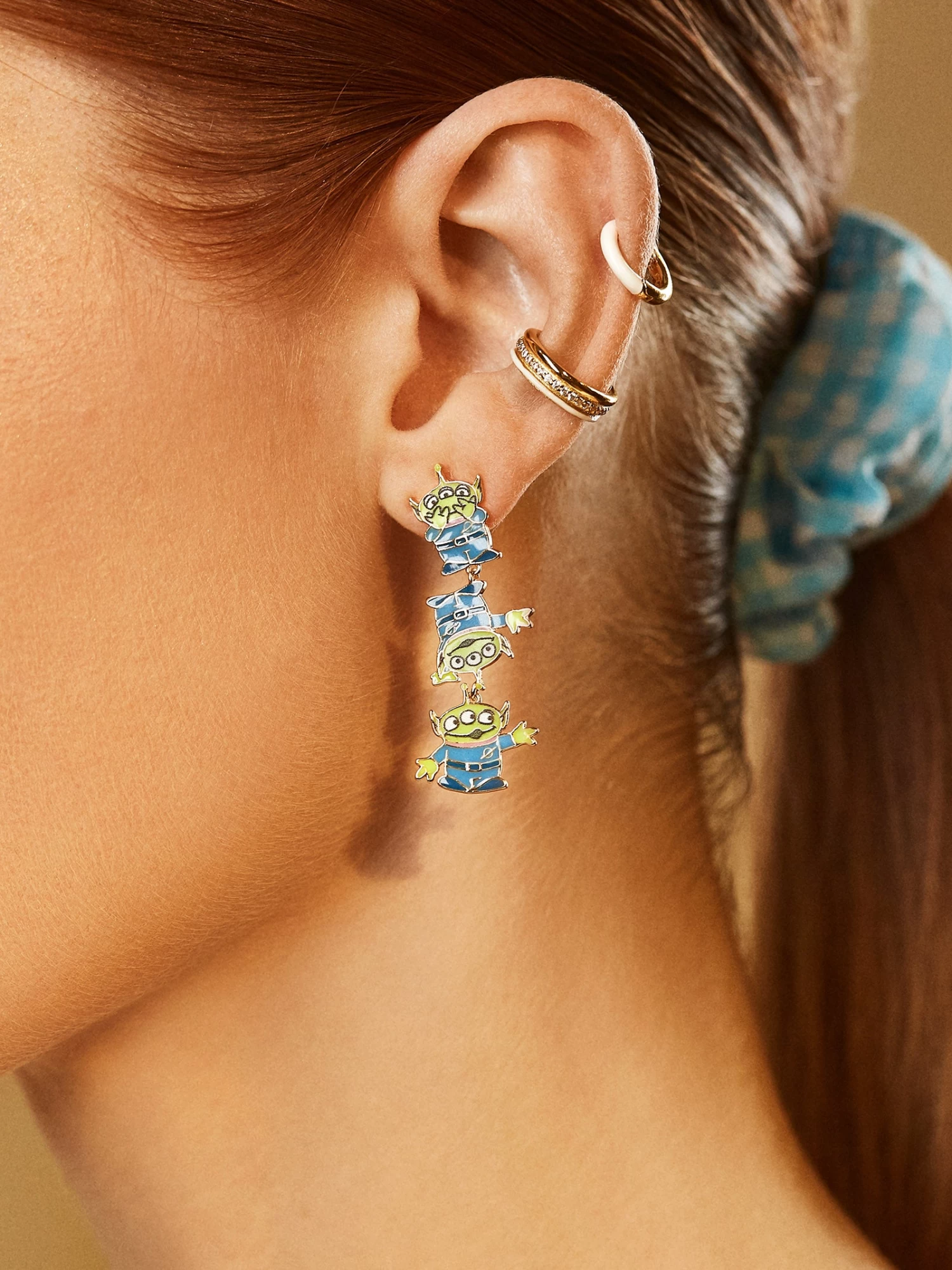 You can’t go wrong with these adorable aliens! This pair of drop earrings features three aliens interconnected at different angles, reminiscent of the claw machine scene in Pixar’s Toy Story. Even better? Each little extra terrestrial is painted with vibrant enamel. These are the perfect pairing for all fans of Disney Pixar’s Toy Story.